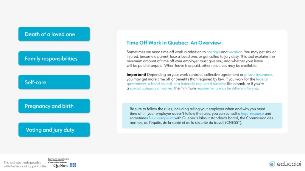 Employees may be required to take time off work for reasons other than vacations or holidays, such as illness, parental responsibilities, bereavement, or jury duty. This interactive tool explains the minimum leave your employer must provide under Quebec law and indicates whether such leave is paid or unpaid.